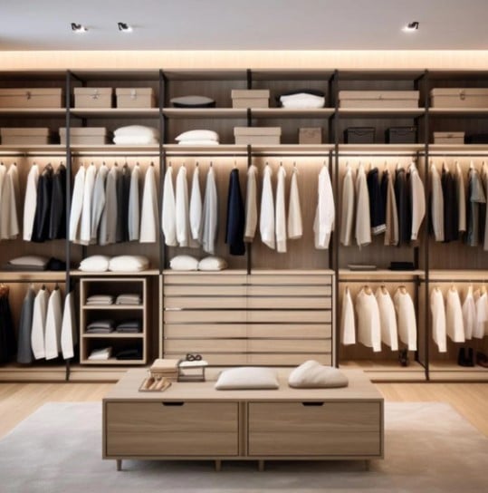 خزينة مكشوفة بتصميم عصري مفتوح تمنحك رؤية كاملة وتنظيمًا أنيقًا للملابس والمفروشات مع توزيع عملي للأرفف والعلاقات والأدراج، مثالية لعشاق الترتيب والستايل الحديث، تضيف لمسة فخامة دافئة للمساحة بفضل خامتها الخشبية وإضاءتها المدمجة.